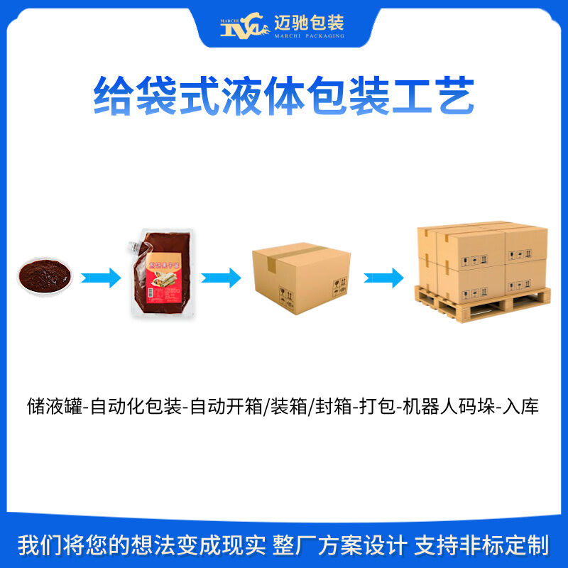 迈驰,是一家专业生产全自动给袋式液体包装流水线的生产厂家,无滴漏、高精度,可根据物料不同特性定制包装流水线设备,一对一定制化服务,26年包装行业经验助力生产企业将本增效,提高产能。